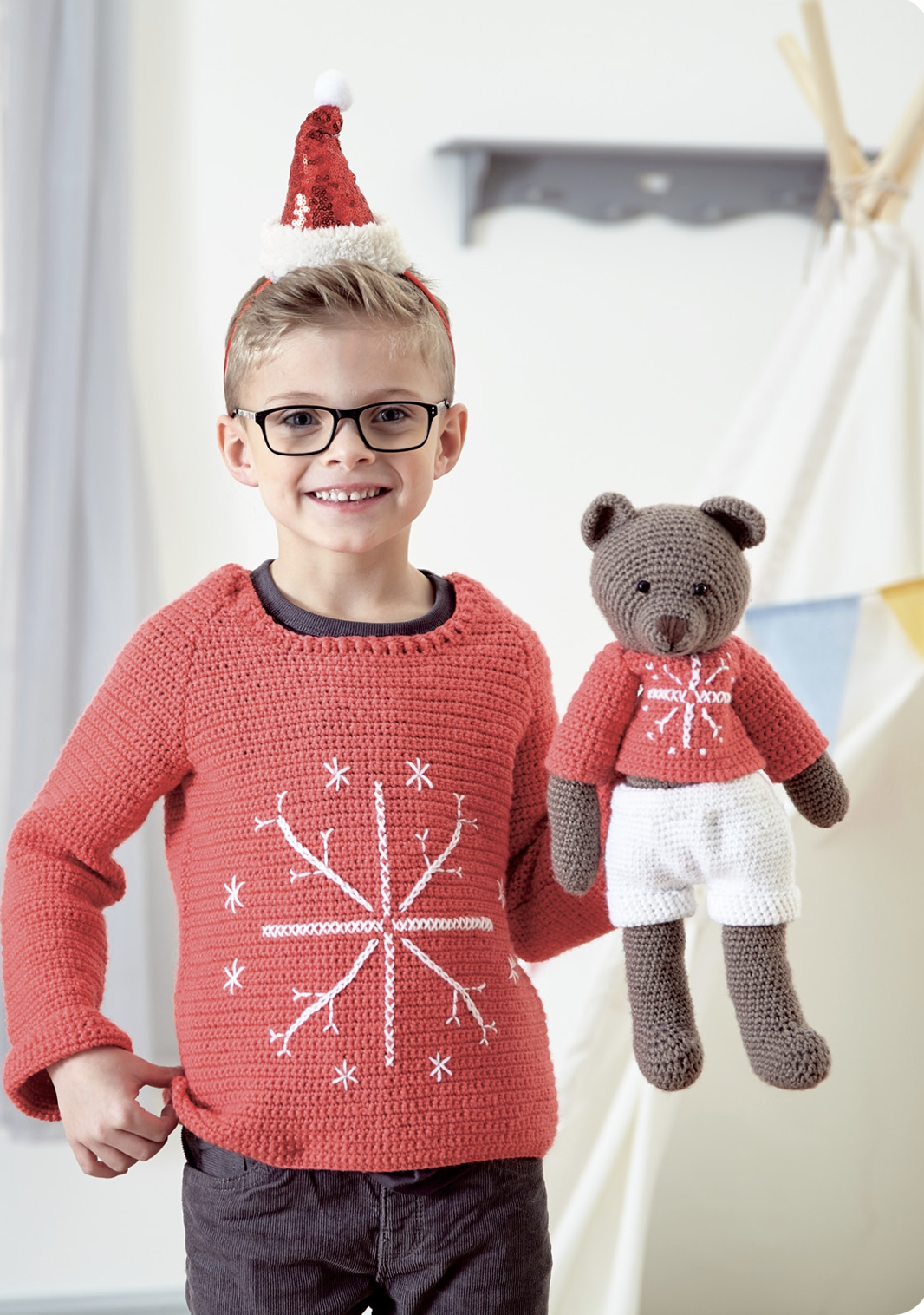 As Bo Bear settles into his cosy retreat, surrounded by the warmth of the crackling crocheted log fire, he is surrounded by an abundance of woolly friends in his festive haven. Dressed in his Santa Suit, Bo Bear is joined by his trusty companion, Travelling Bo who has’ travelled home for Christmas’ wearing his Christmas snowflake jumper.