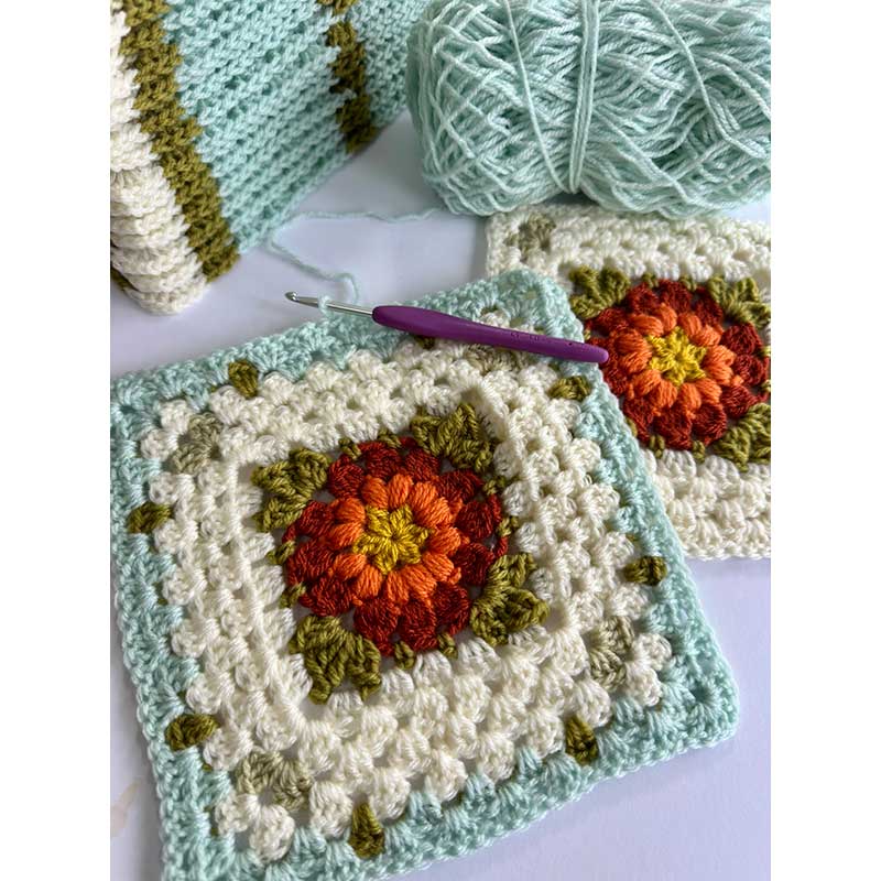 The Trellis Blanket Kit by Anita Gibney also known as Made by Anita is made of sixteen identical squares and easily adaptable to other sizes.