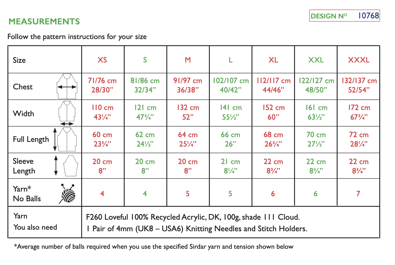 Sirdar Loveful Acrylic DK - Ozone Jacket 10768 Knitting Pattern (download) This simple knitting pattern is as easy to make as it is to wear, the edge-to-edge Ozone Jacket is knit in simple stocking stitch. With relaxed drop shoulders, elbow length sleeves and invisible pockets, this is a perfect all-season layering piece in soft, earth-friendly Sirdar Loveful 100% Recycled Acrylic. You Will Also Need: 1 Pair of 4mm (UK8 – USA6) Knitting Needles and Stitch Holders. Skill Level: Easy Technique: Knitting Pattern Number: 10768