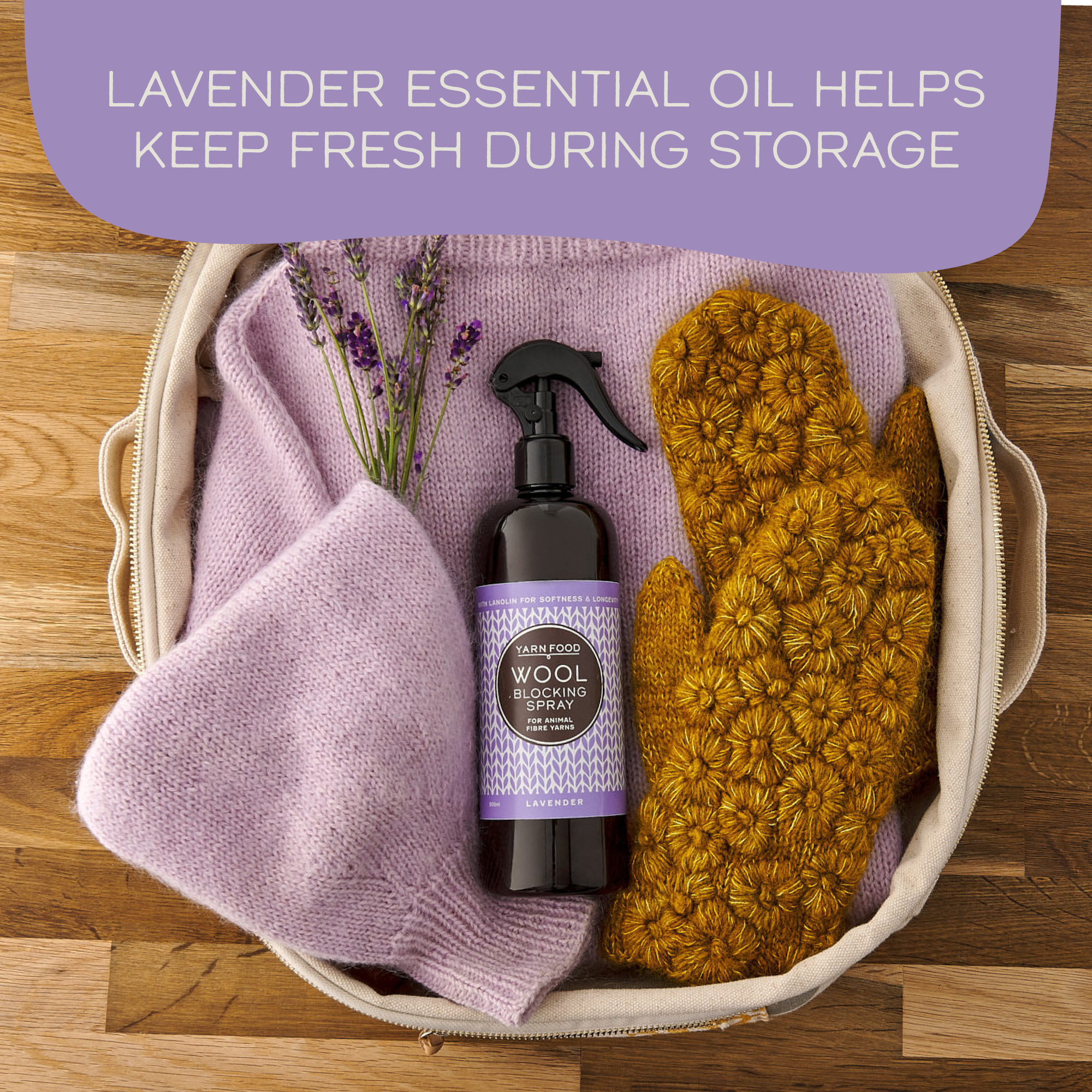 Yarn Food Blocking Spray for Wool & Animal Fibre Yarns is expertly designed for yarn crafters to nourish and preserve wool- and animal fibre yarns such as merino, cashmere, mohair, alpaca, angora, camel and their blends during the spray blocking process.